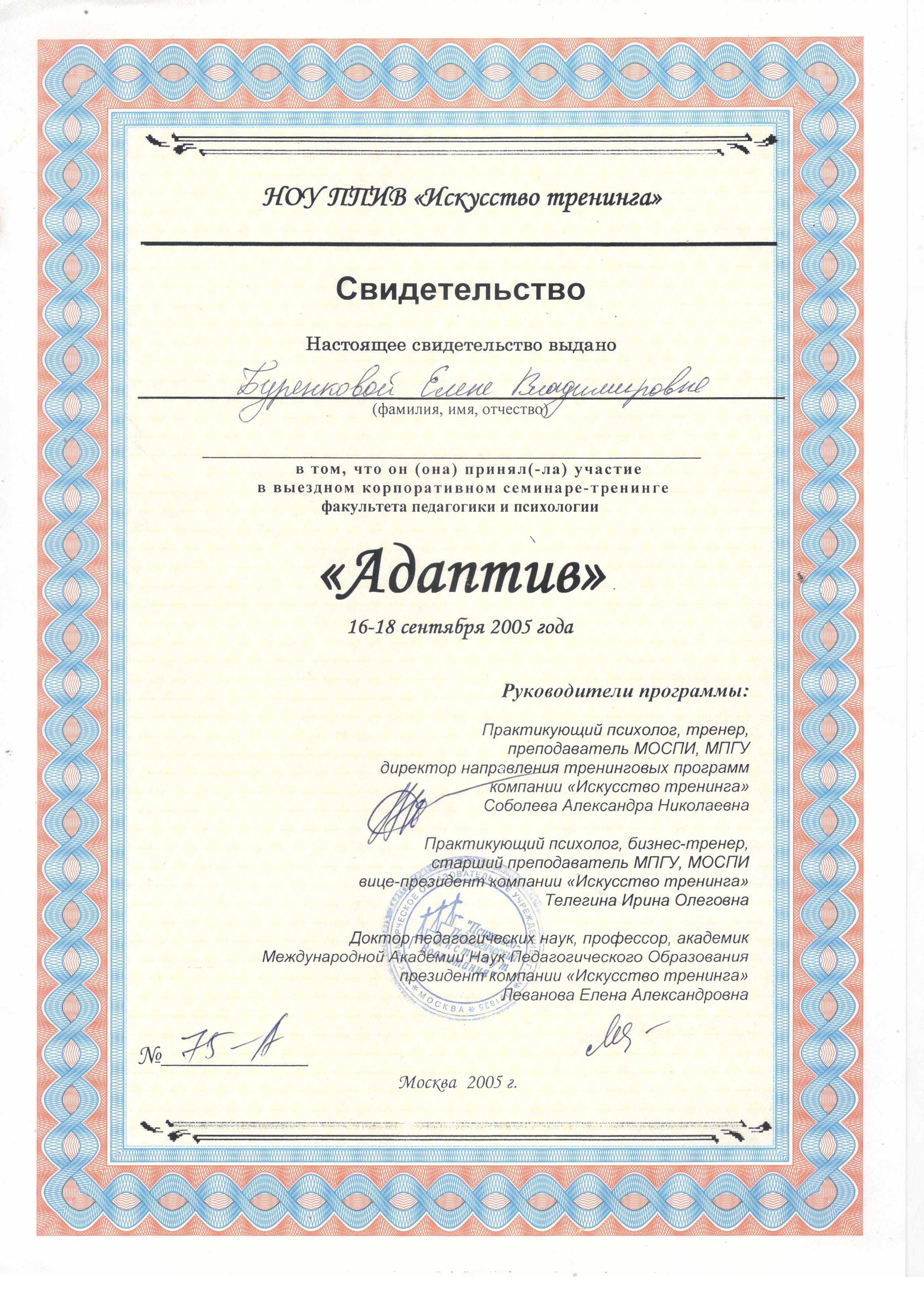 - 16.09.2005 - 18.09.2005 г. - ОУ ППИВ «Искусство тренинга». «Адаптив» (группообразование, личностный рост). (свидетельство №75-А).