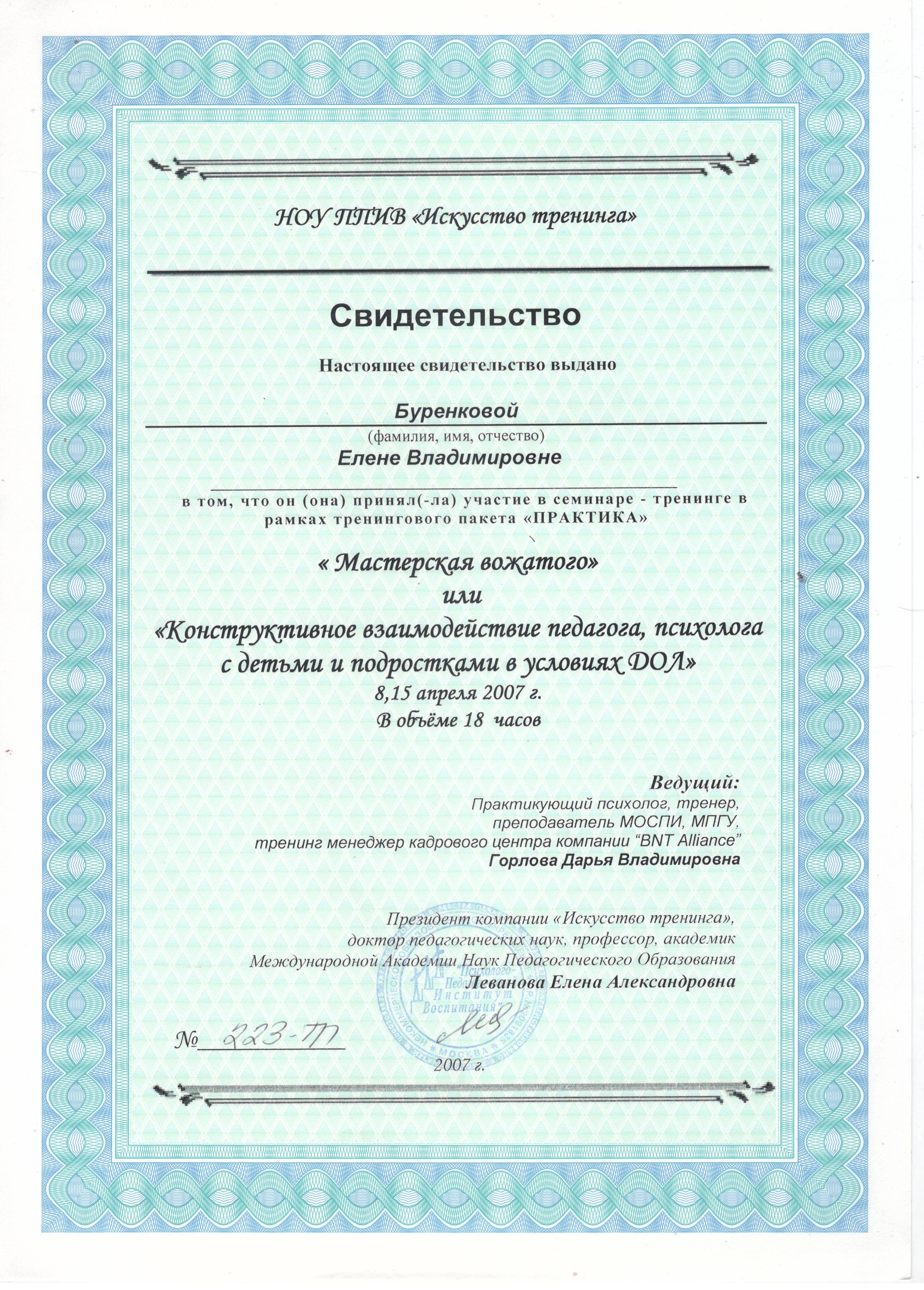 - 08.09.2007 - 15.04.2007 г. - НОУ ППИВ «Искусство тренинга». «Конструктивное взаимодействие педагога-психолога с детьми и подростками в условиях ДОЛ» (свидетельство № 223-ТП, 18 часов).