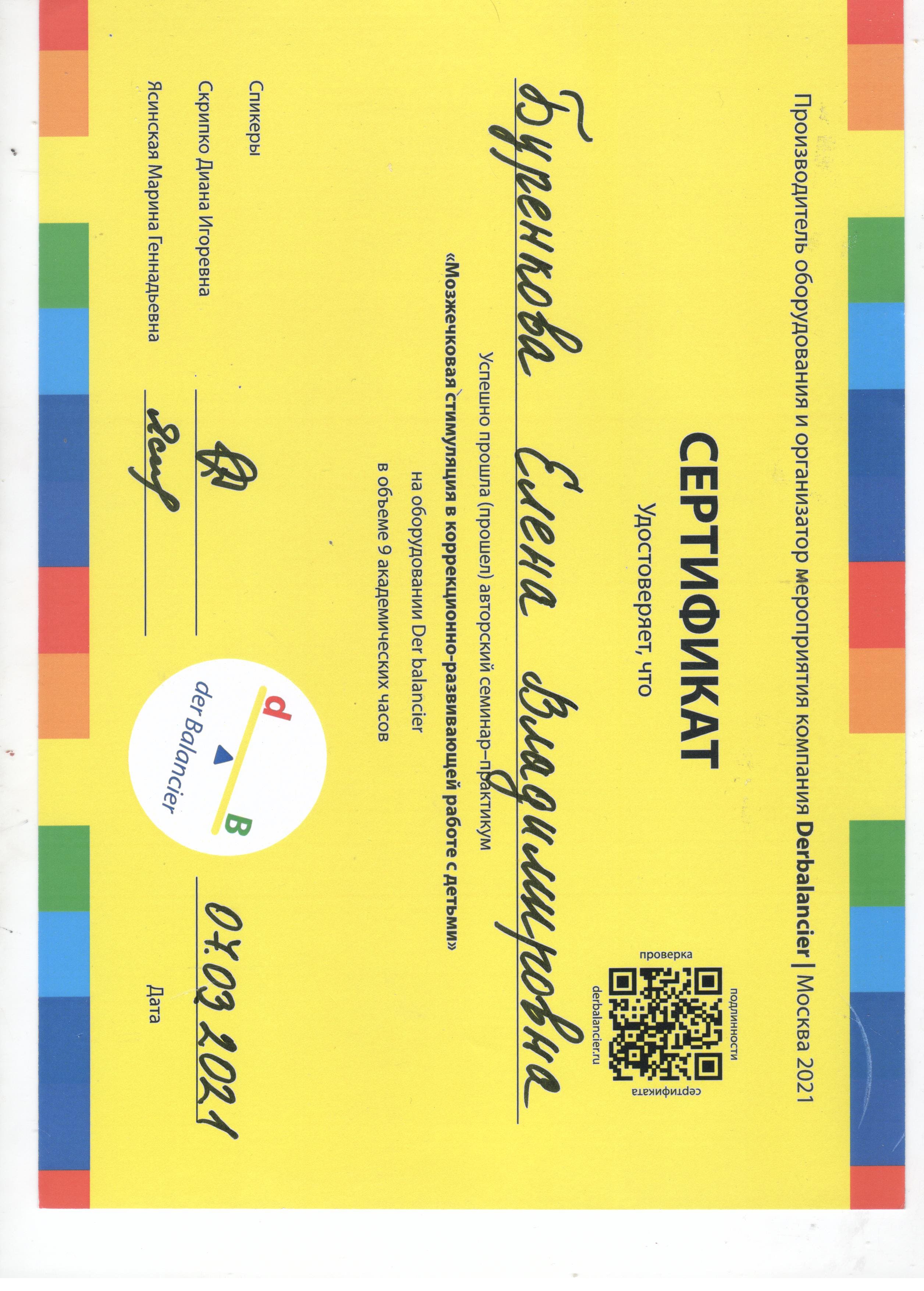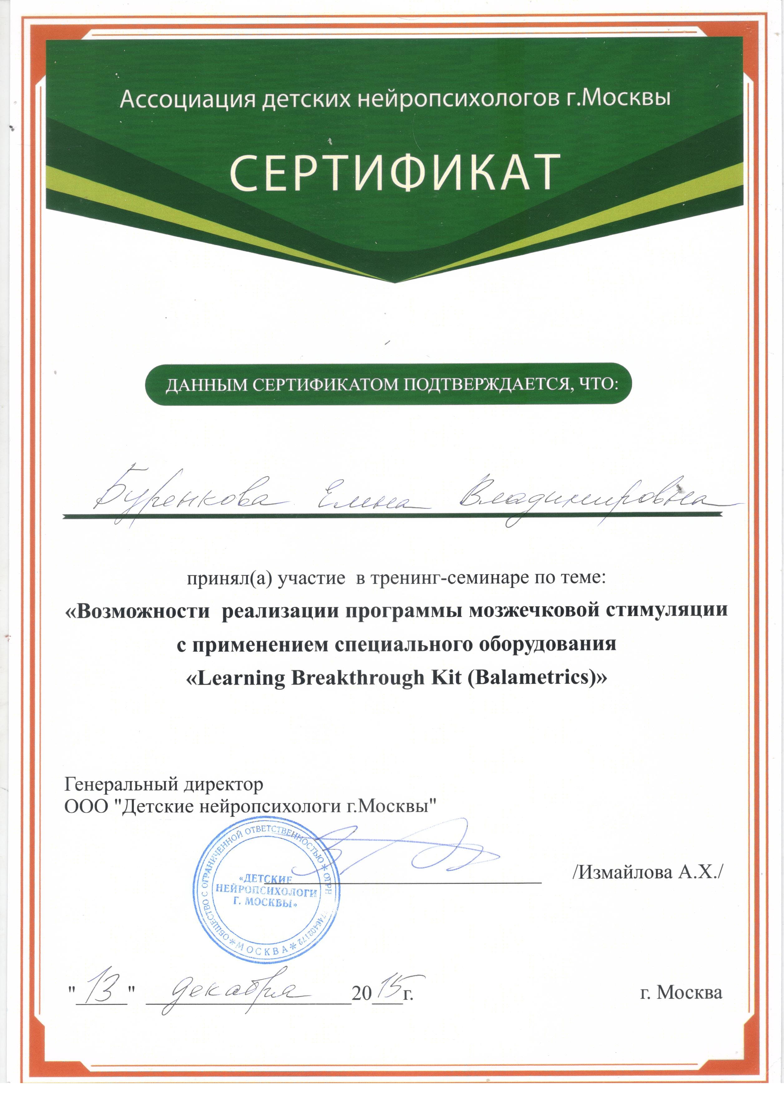 - 13.12.2015 г. - "Возможности реализации программы мозжечковой стимуляции с применением специального оборудования "Learning Breakthrough Kit (Balametrics)" Москва, Ассоциация детских нейропсихологов.