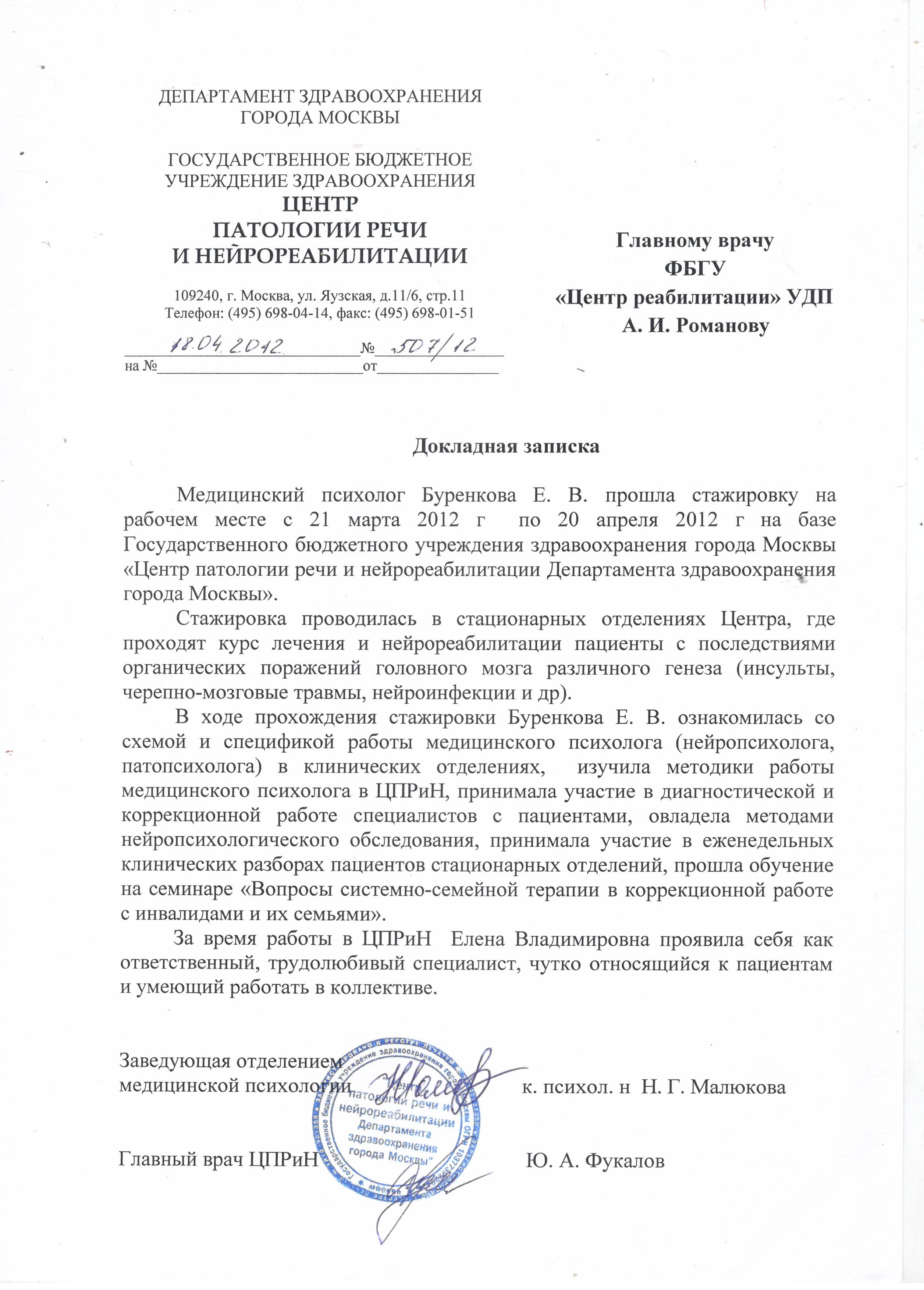 2012 г. – 02.10.2018 г. ФГБУ Центр реабилитации Управления делами президента РФ. Клинический психолог, нейропсихолог. Должностные обязанности, профессиональные навыки, умения: Проведение нейропсихологического обследования, составление индивидуальных программ реабилитационных мероприятий (восстановление ВПФ, коррекция эмоционально-личностных нарушений), наблюдение за динамикой восстановления, консультирование пациентов по вопросам интеграции в обществе, профессиональной ориентации. В частности, проведение первичного нейропсихологического обследования речи и других высших психических функций, осуществление детальной качественной оценки выявленной симптоматики в установленной форме. Осуществление логопедического, нейропсихологического, патопсихологического, экспресс-диагностического обследования детей и взрослых. Осуществление динамического наблюдения с качественной оценкой состояния речи и других высших психических функций в середине курса нейрореабилитации с целью корректировки индивидуальной программы нейрореабилитации. Оценивание эффективности лечебного и реабилитационного воздействия на разных этапах. Осуществление консультативной работы с ближайшими родственниками пациента, с целью, специализированной психологической и нейрологопедической помощи. Осуществление прогностической оценки нейрореабилитации. Формирование положительного эмоционального состояния пациента, выбор формы мотивации к занятиям и социальной адаптации пациента. Психотерапевтическая работа. Педагогическая и просветительская работа: чтение курса лекций и проведение практических занятий с медицинским персоналом («Этика и деонтология в медицине», «Психологические особенности пациентов с заболеваниями различного профиля, взаимодействие с больными и их родственниками», и др.)