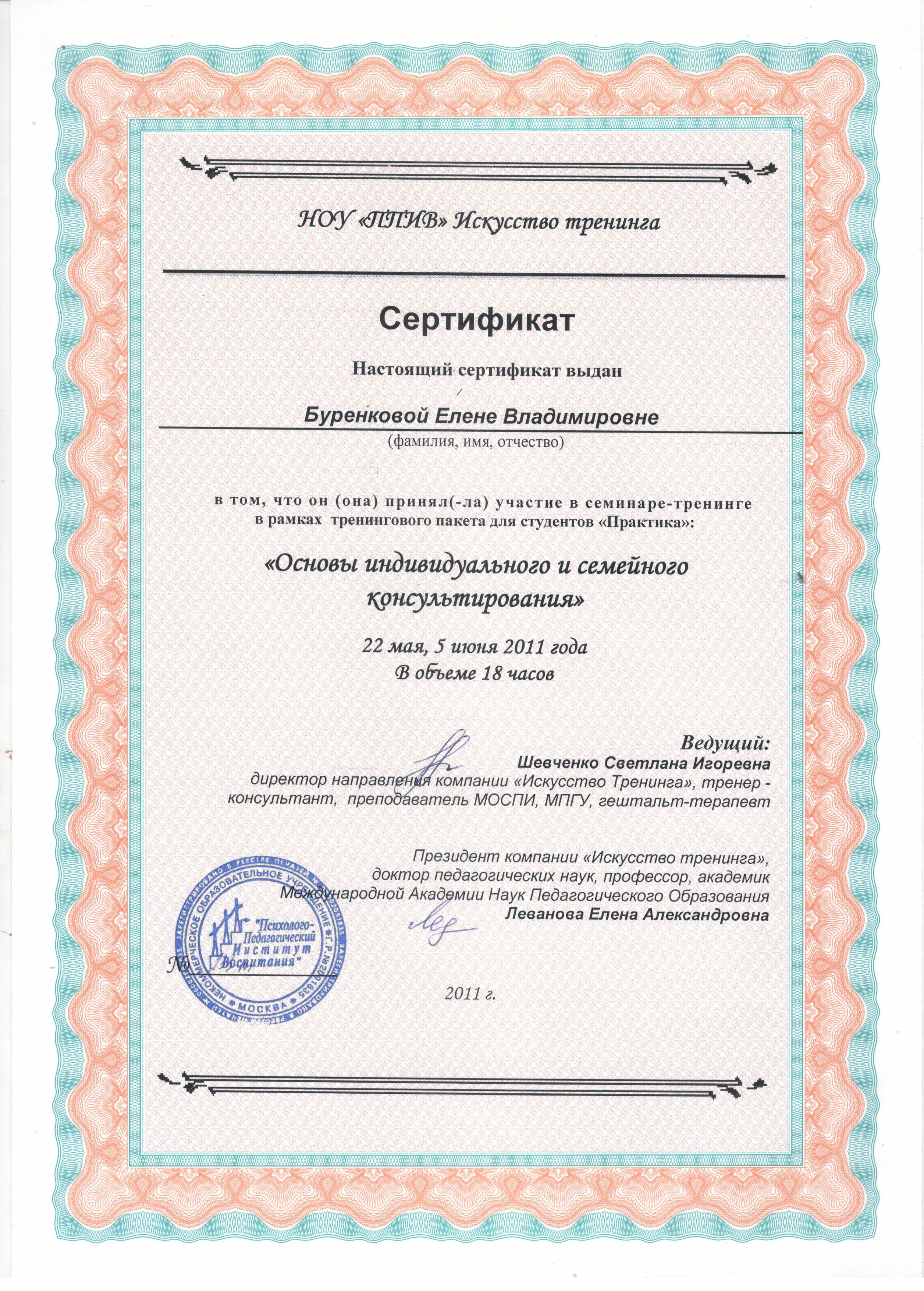 - 05.04.2011 г. - НОУ ППИВ «Искусство тренинга». «Основы индивидуального и семейного консультирования». (свидетельство № 233-Т, 18 часов).