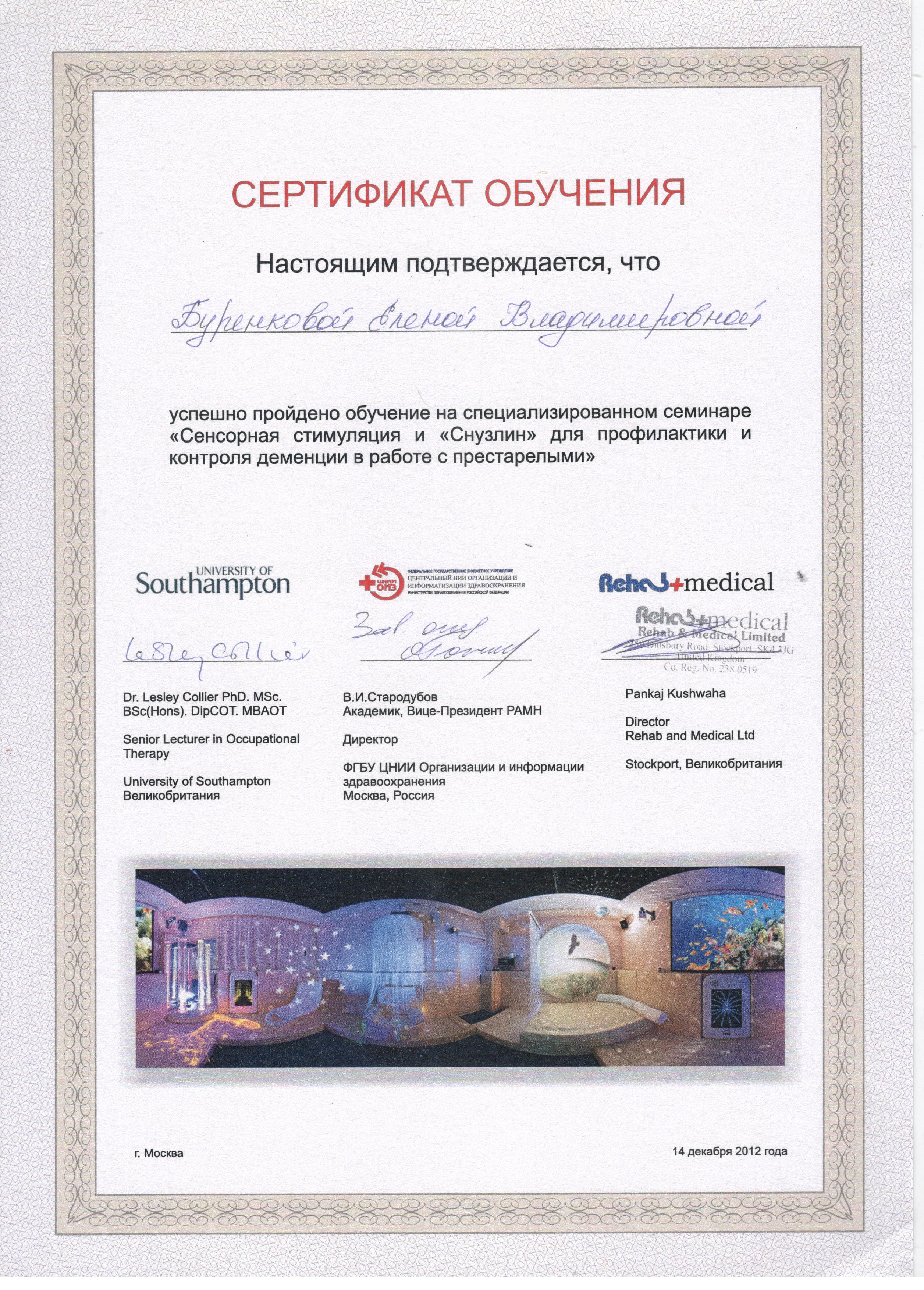 - 2012 г. - "Сенсорная стимуляция и "Снузлин" для профилактики и контроля деменции в работе с престарелыми".