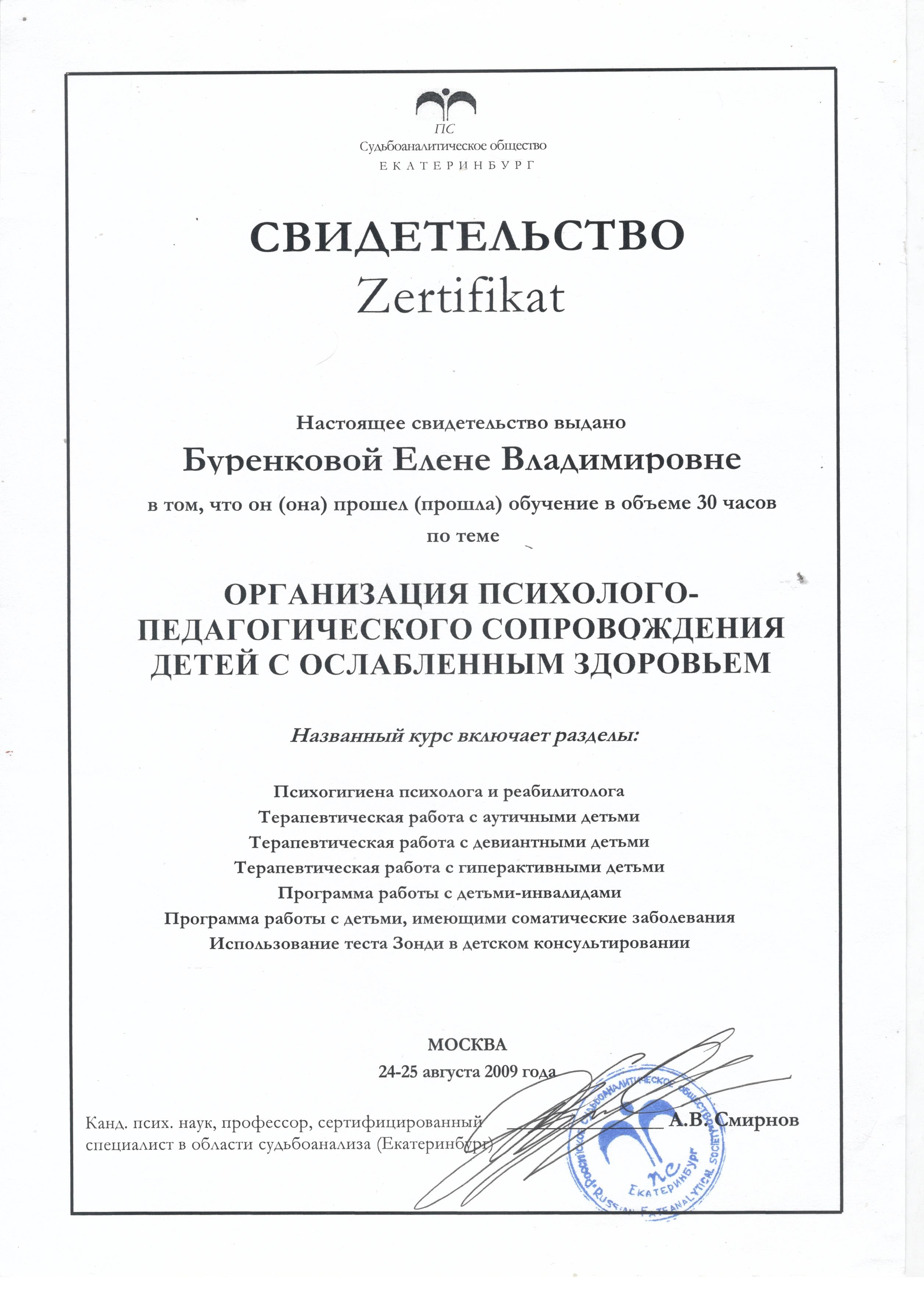 - 20.08.2009 - 25.08.2009г. - Одинцовский центр диагностики и консультирования. "Организация психолого-педагогического сопровождения детей с ослабленным здоровьем" (30 часов).
