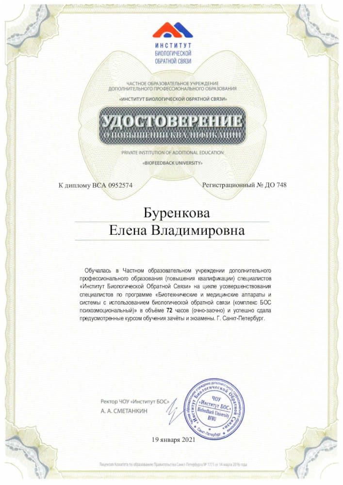 - 2021 - Курс повышения квалификации по программе «Биотехнические и медицинские аппараты и системы с использованием биологической обратной связи (комплекс БОС психоэмоциональный)» на базе Института биологической обратной связи.