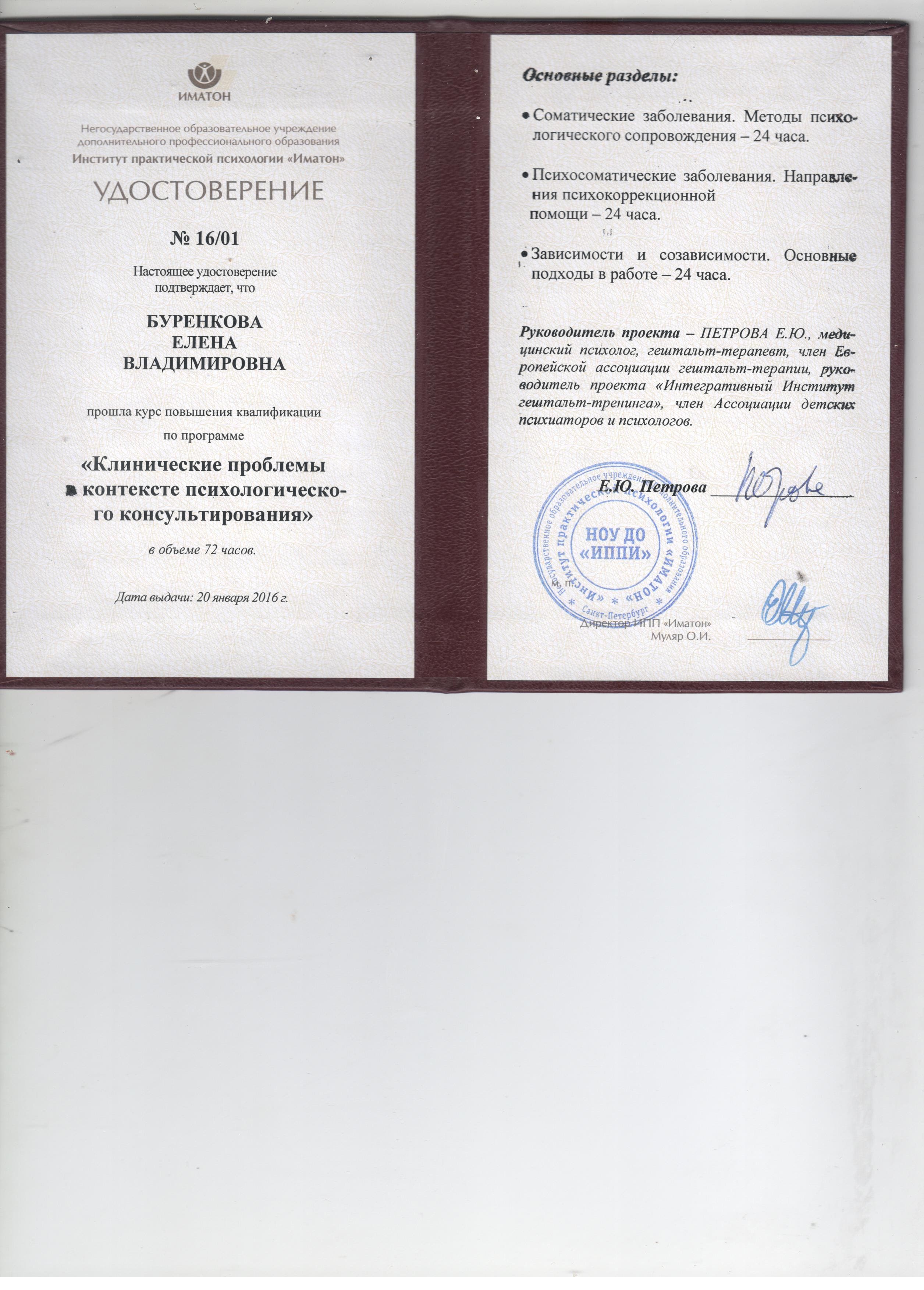 - 11.01.2016 - 20.01.2016 г. - "Клинические проблемы в контексте психологического консультирования" 72 часа, Санкт-Петербург, Институт практической психологии "Иматон".