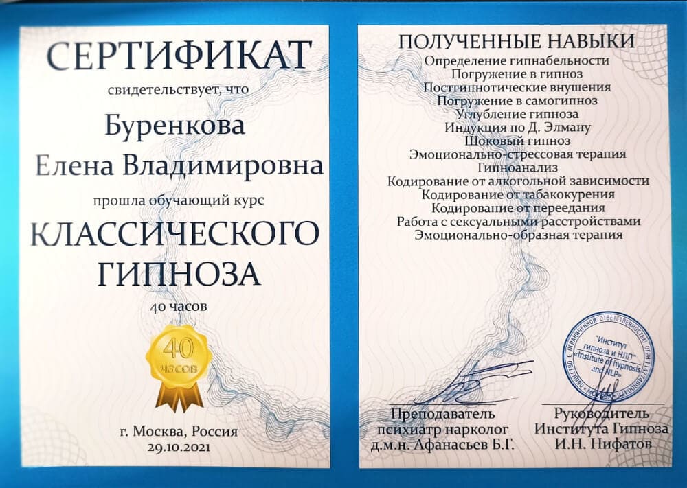- 2021 - Курс повышения квалификации по программе ««Классический гипноз» на базе Института гипноза и НПЛ.