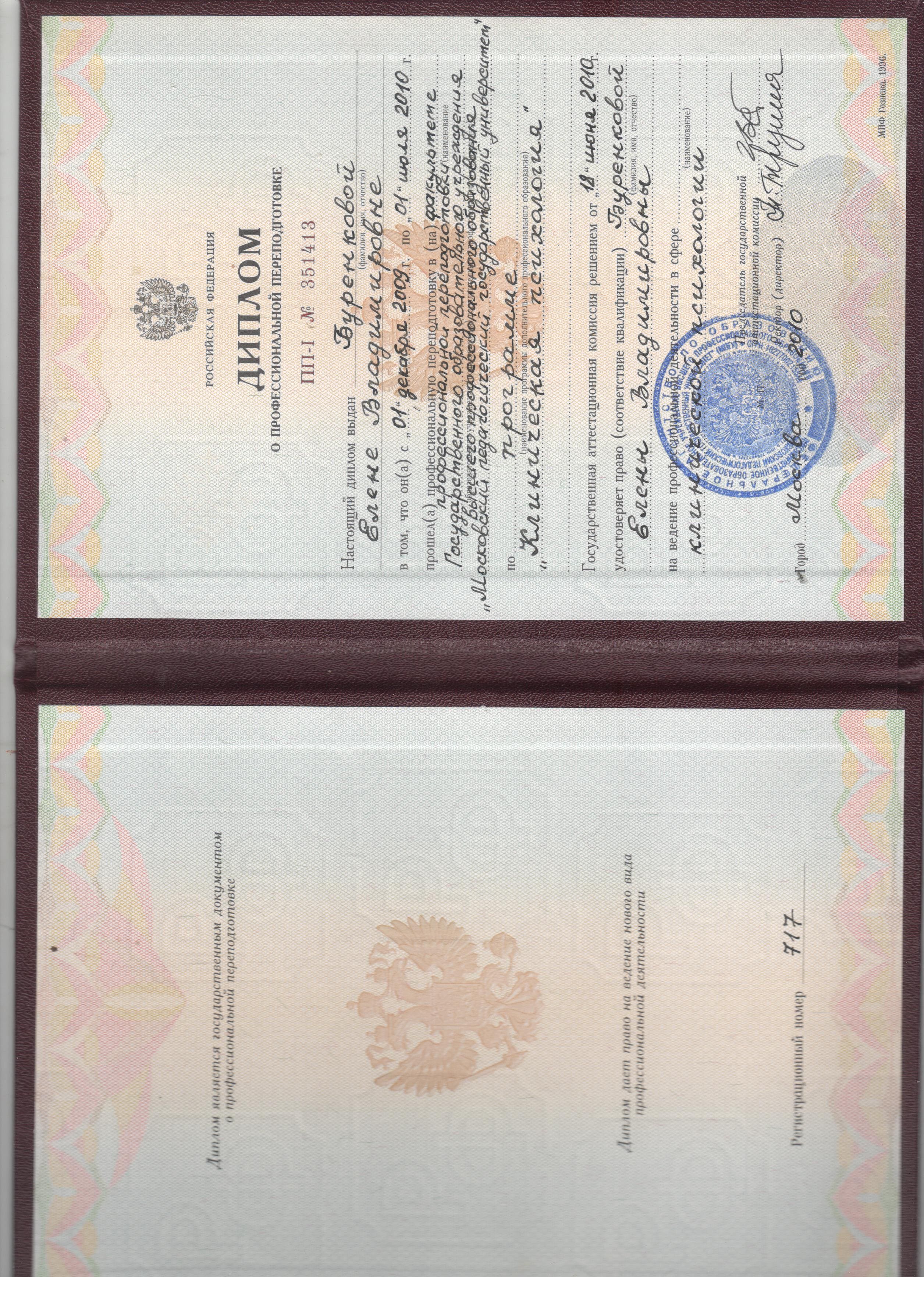 01.12.2009 - 01.07.2010г. Московский педагогический государственный университет. Факультет профессиональной переподготовки. Специальность: «Клинический психолог» (диплом о профессиональной переподготовке ПП-I № 351413, тема диплома: «Психологическая профилактика суицидального поведения подростков», стажировка на базе Психиатрической больницы №13 Департамента здравоохранения г. Москвы.).