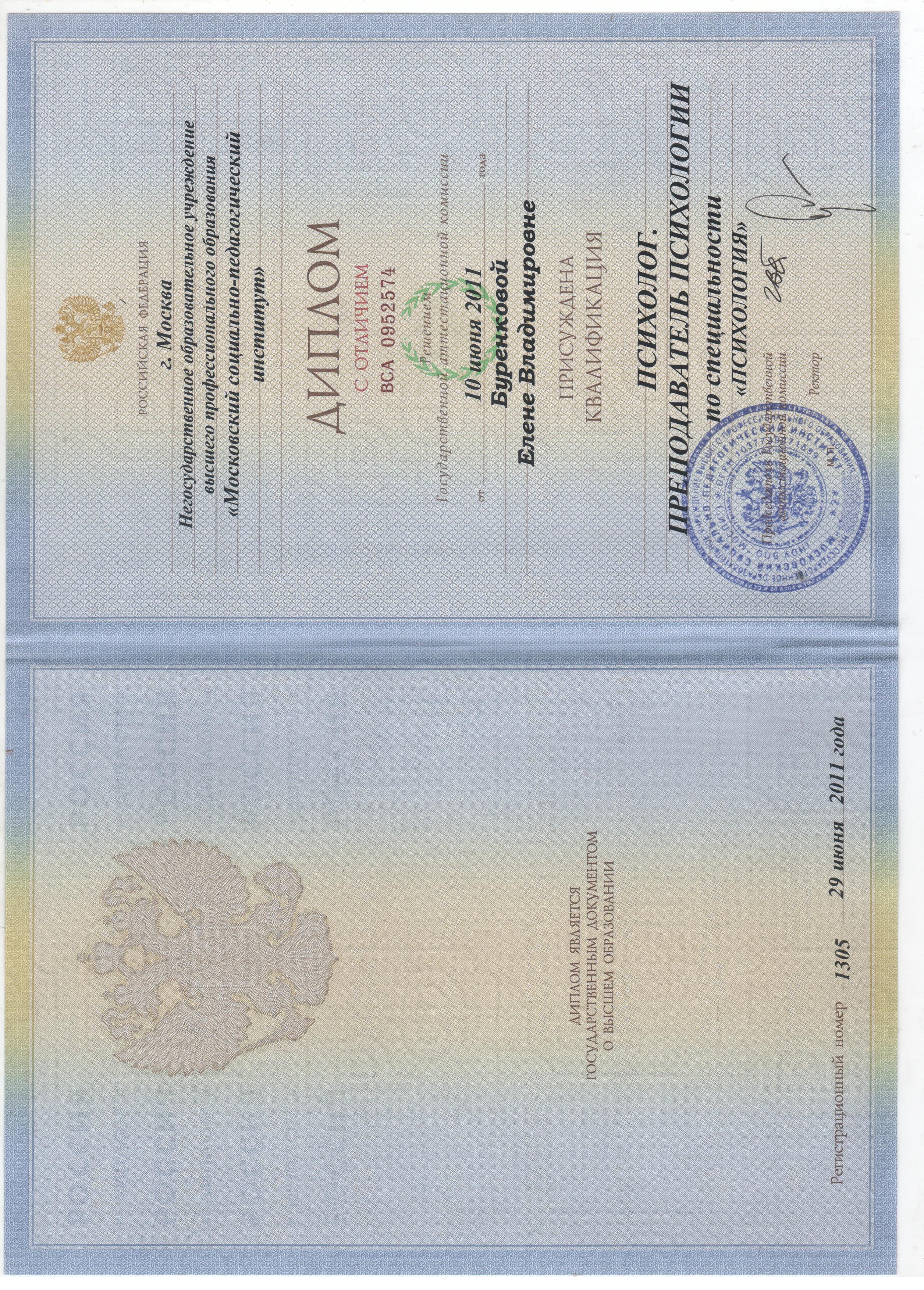 2005-2011 г. Московский социально-психологический институт при Московском педагогическом государственном университете. Факультет педагогики и психологии. Специальность: «Психолог, преподаватель психологии». Специализация: «Психологическое консультирование» (диплом с отличием ВСА №0952574, тема дипломной работы «Взаимосвязь суицидальных наклонностей подростков с агрессией и самооценкой»).