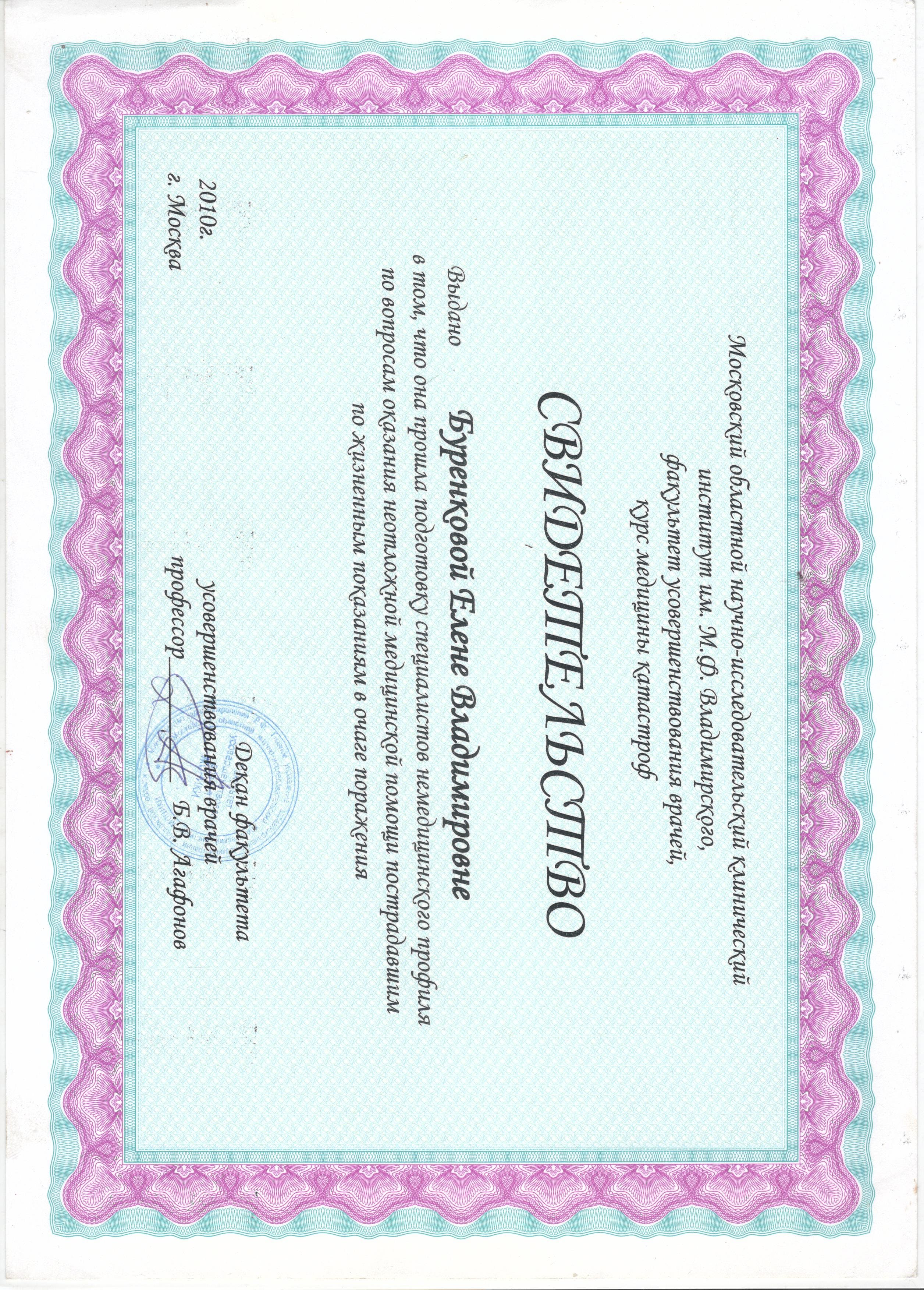 - 01.09.2009 - 15.05. 2010 г. - МОНИКИ им. М.Ф. Владимирского. Факультет усовершенствования врачей, курс медицины катастроф «Оказание неотложной медицинской помощи пострадавшим по жизненным показаниям в очаге поражения» (свидетельство о подготовке).