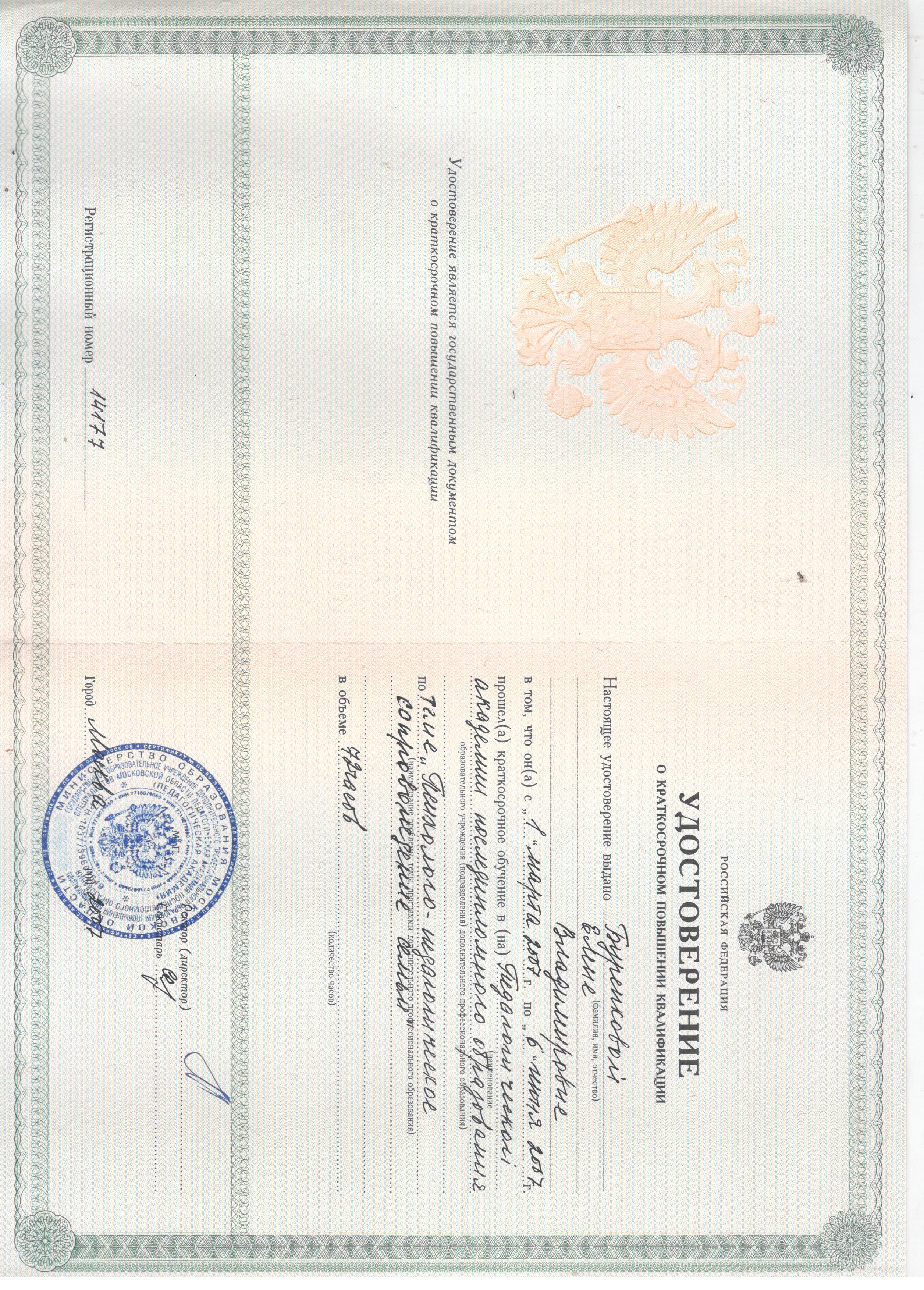 - 01.03.2007 - 06.06.2007г. - Педагогическая академия последипломного образования, «Психолого-педагогическое сопровождение семьи» (удостоверение о краткосрочном повышении квалификации №14177, 72 часа).