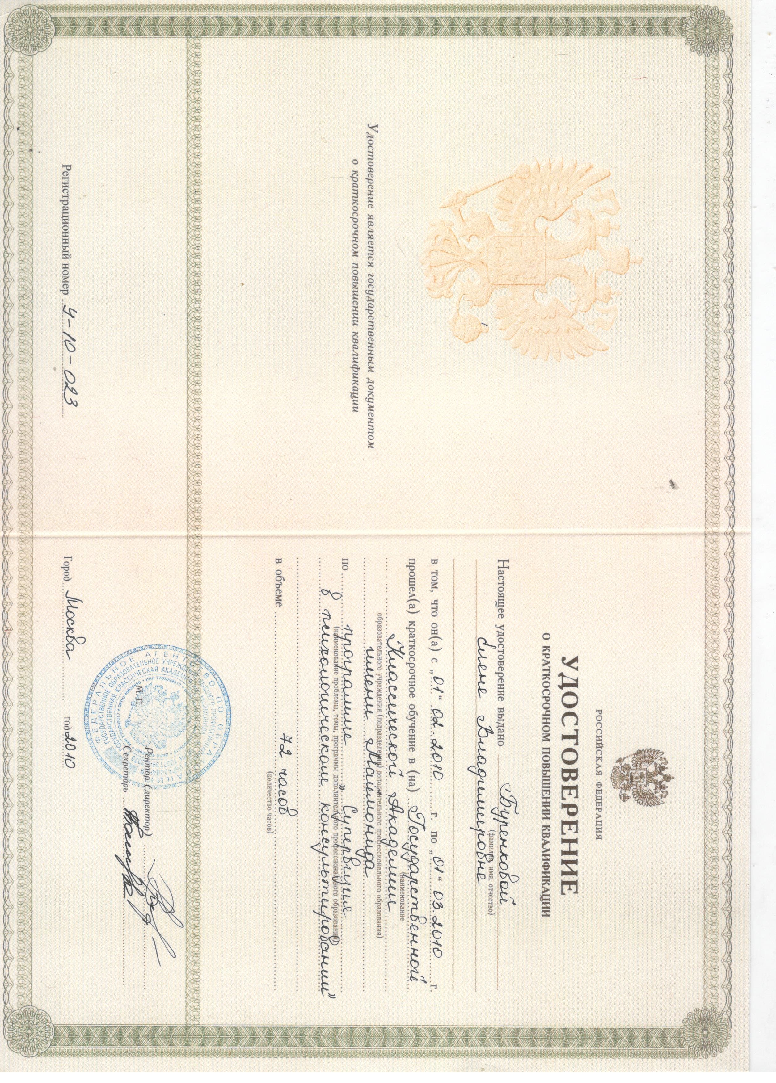 - 01.02.2010 - 01.03.2010г. - Государственная Классическая Академия им. Маймонида, "Супервизия в психологическом консультировании" (удостоверение о краткосрочном повышении квалификации У-10-023, 72 часа).