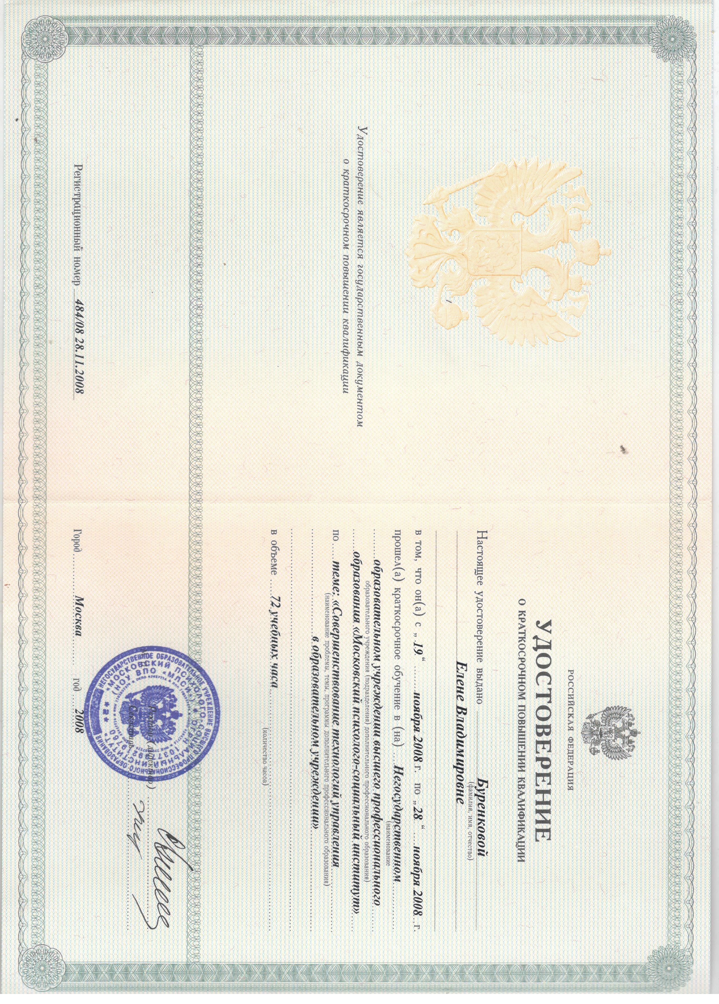 - 19.11.2008 - 28.11.2008г. - НОУ высшего профессионального образования "Московский психолого-социальный институт", "Совершенствование технологий управления в образовательном учреждении" (удостоверение 484/08 о краткосрочном повышении квалификации 72 ч.).