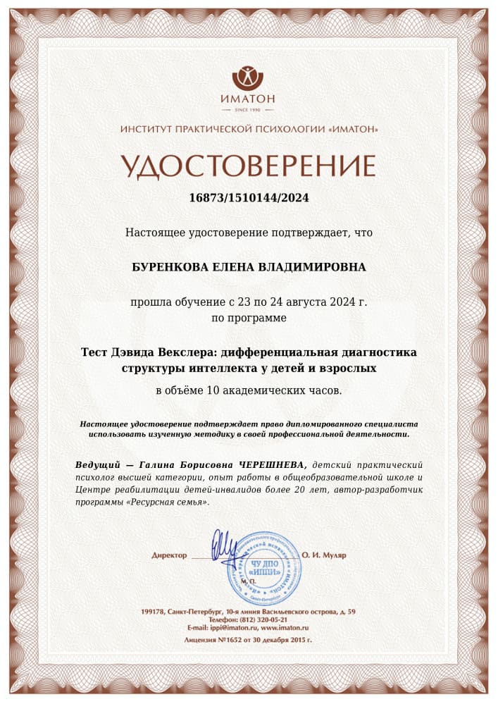 - 2024 - Прошла курс повышения квалификации по программе «Тест Дэвида Векслера: дифференциальная диагностика структуры интеллекта у детей и взрослых» на базе Института практической психологии ИМАТОН.