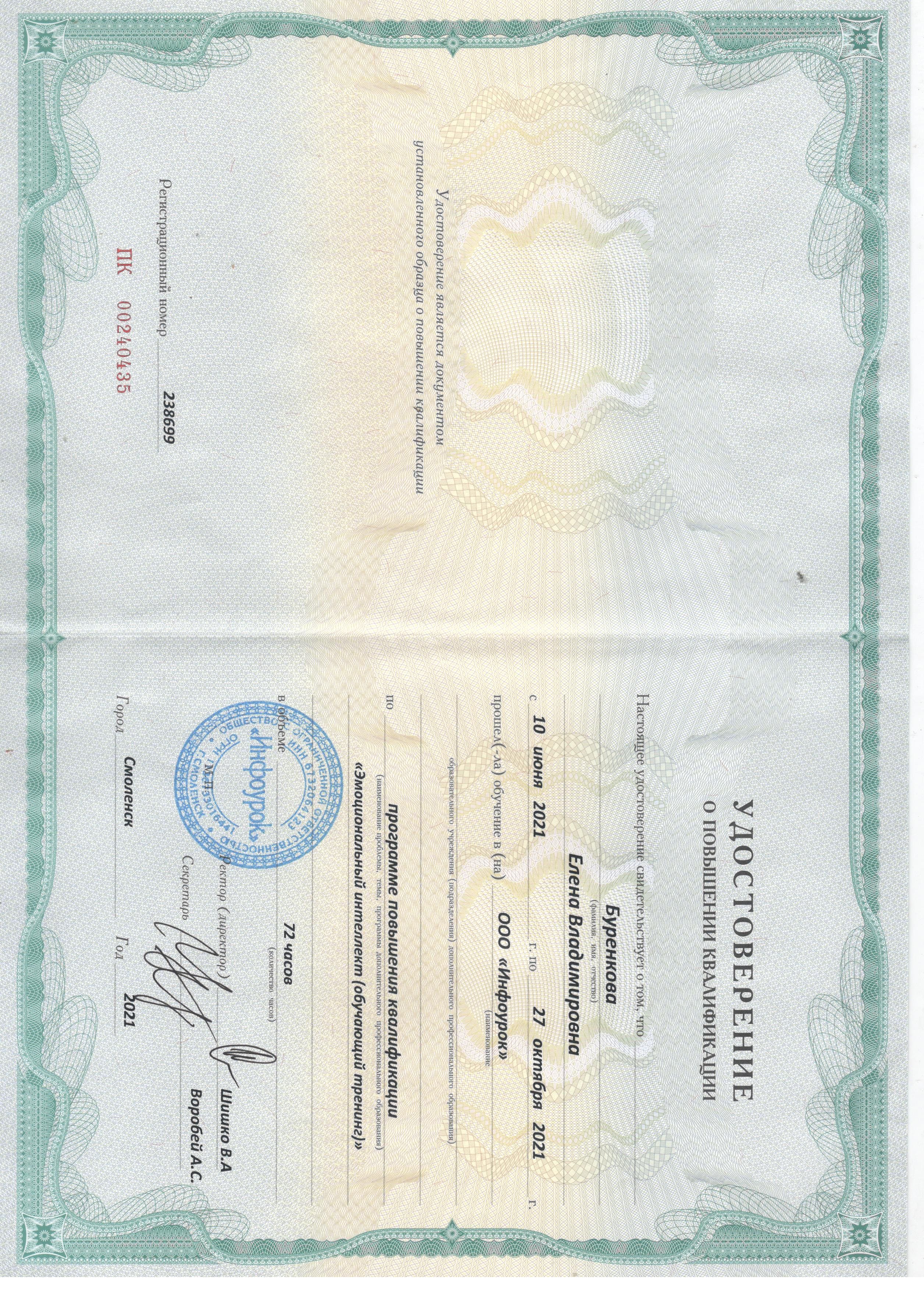 - 2021 - Курс повышения квалификации по программе «Эмоциональный интеллект (обучающий тренинг)» на базе ООО «Инфоурок».