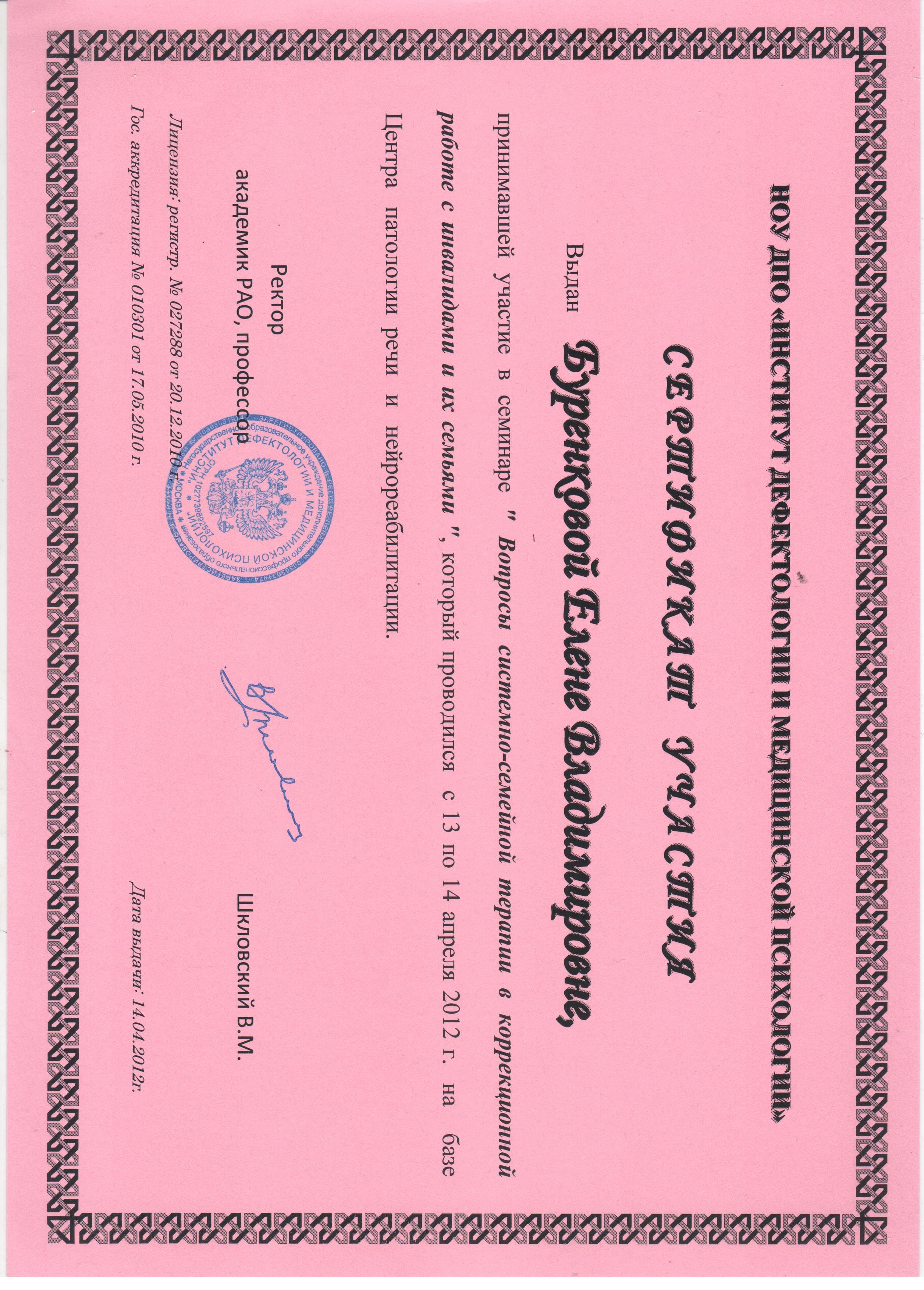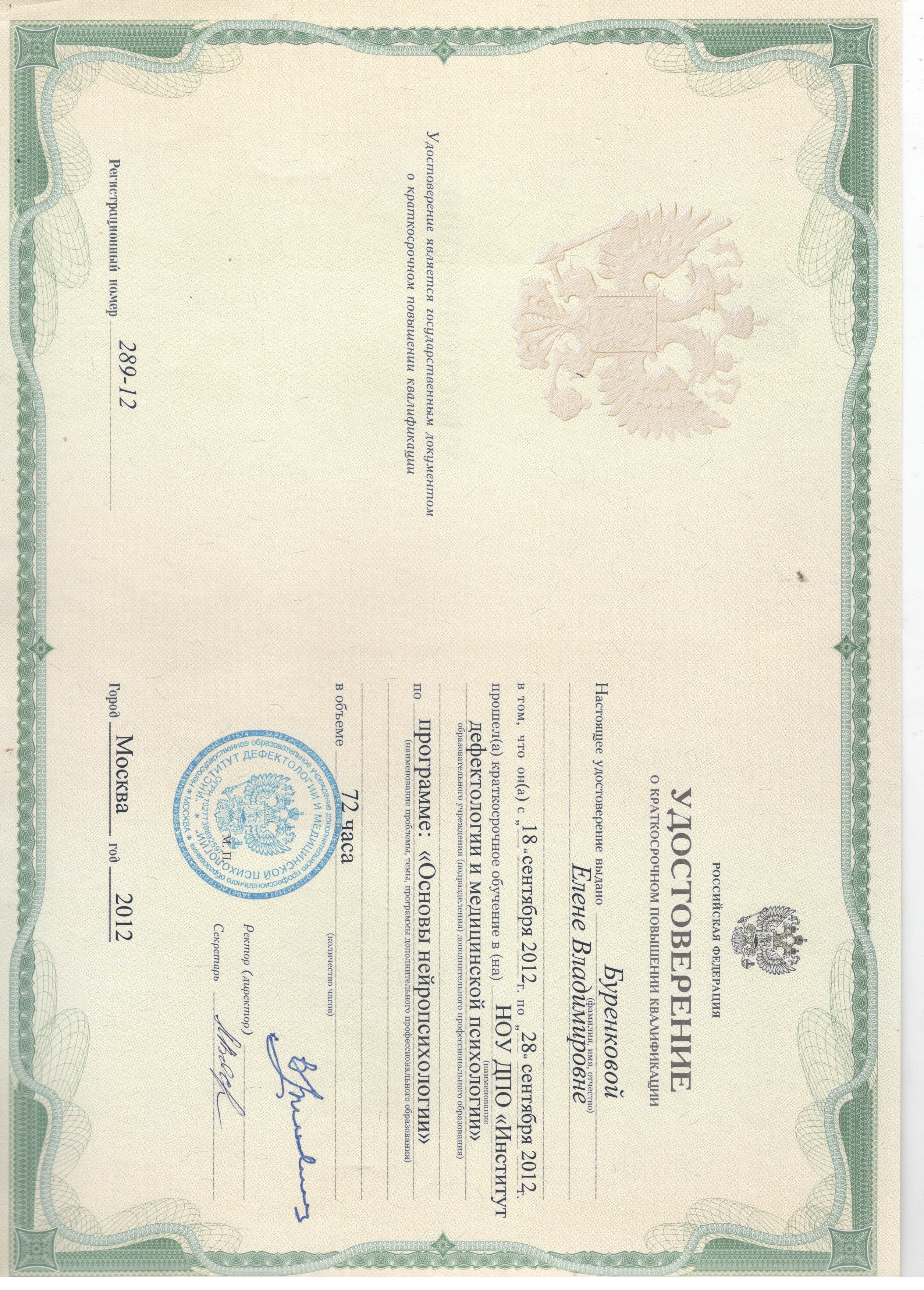 - 18.09.2012 - 28.09.2012 г. - НОУ ДПО "Институт дефектологии и медицинской психологии". "Основы нейропсихологии" (удостоверение о краткосрочном повышении квалификации 289-12, 72 часа).