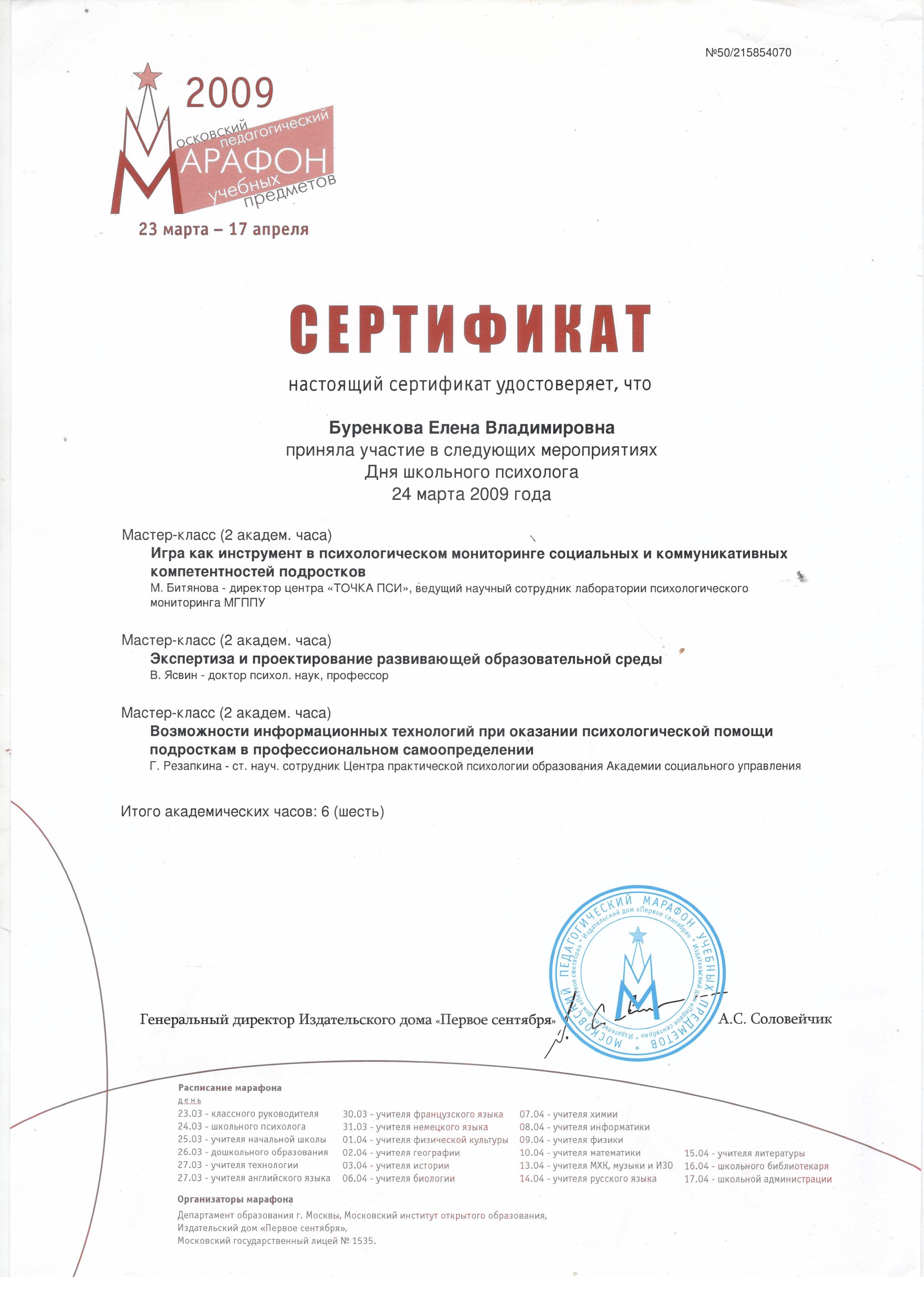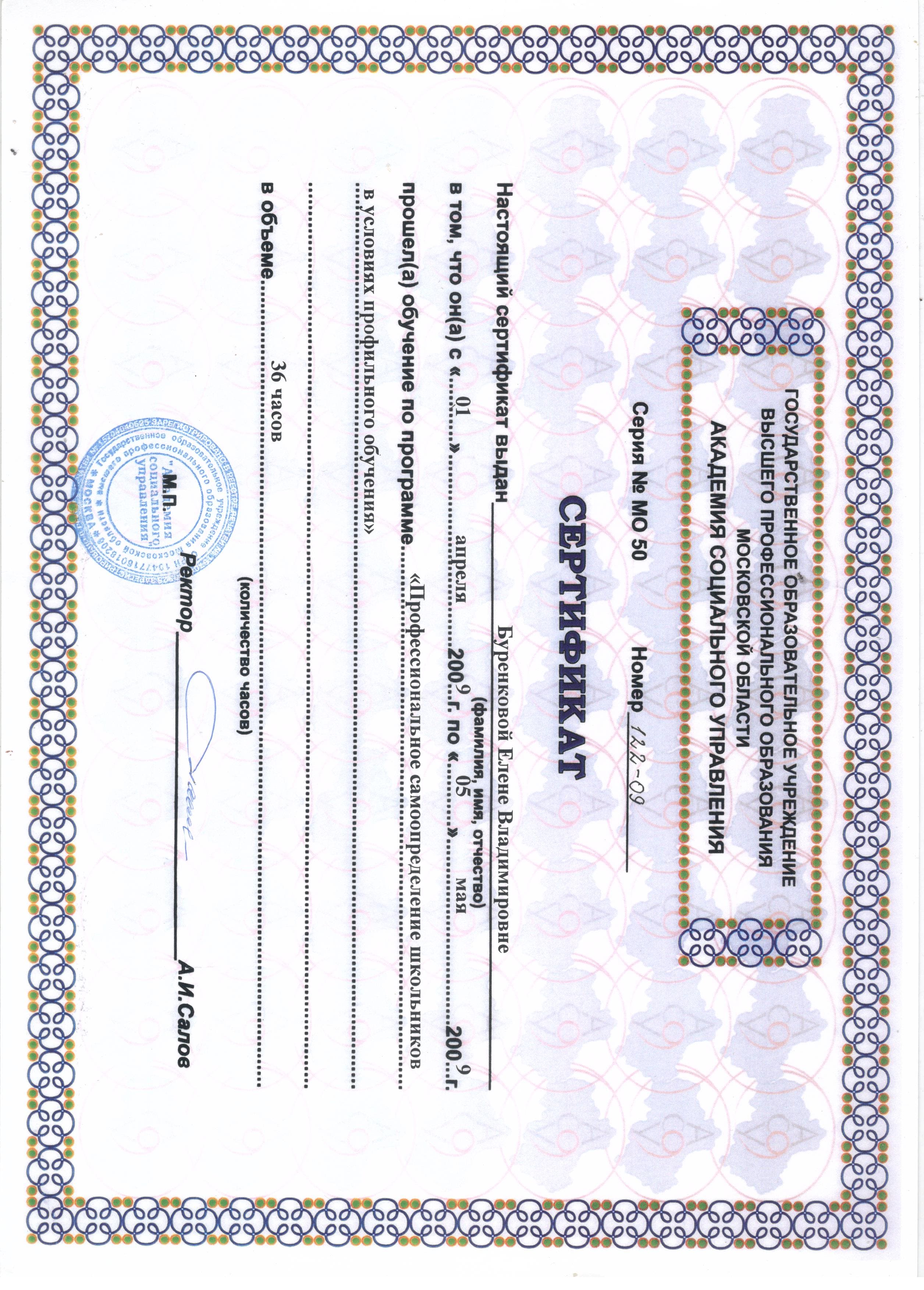 - 01.04.2009 - 05.05.2009г. - ГОУ высшего профессионального образования Московской области «Академия социального управления», «Профессиональное самоопределение школьников в условиях профильного обучения» (сертификат МО 50 №122-09, 36 часов).