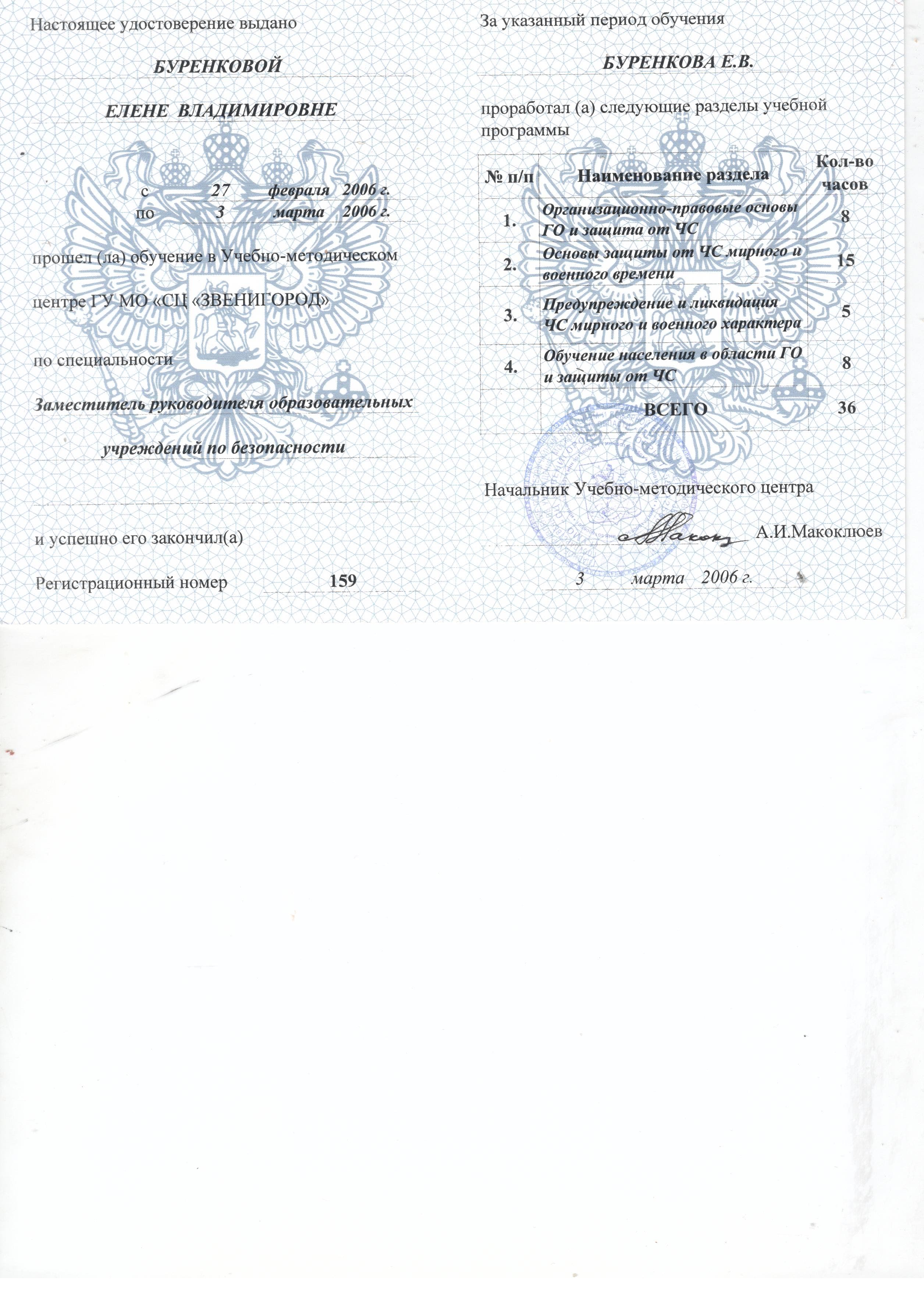 - 27.02.2006 - 03.03.2006г. - Учебно-методический центр ГУ МО «СЦ Звенигород», специальность: Заместитель руководителя образовательного учреждения по безопасности (удостоверение №159, 36 часов).